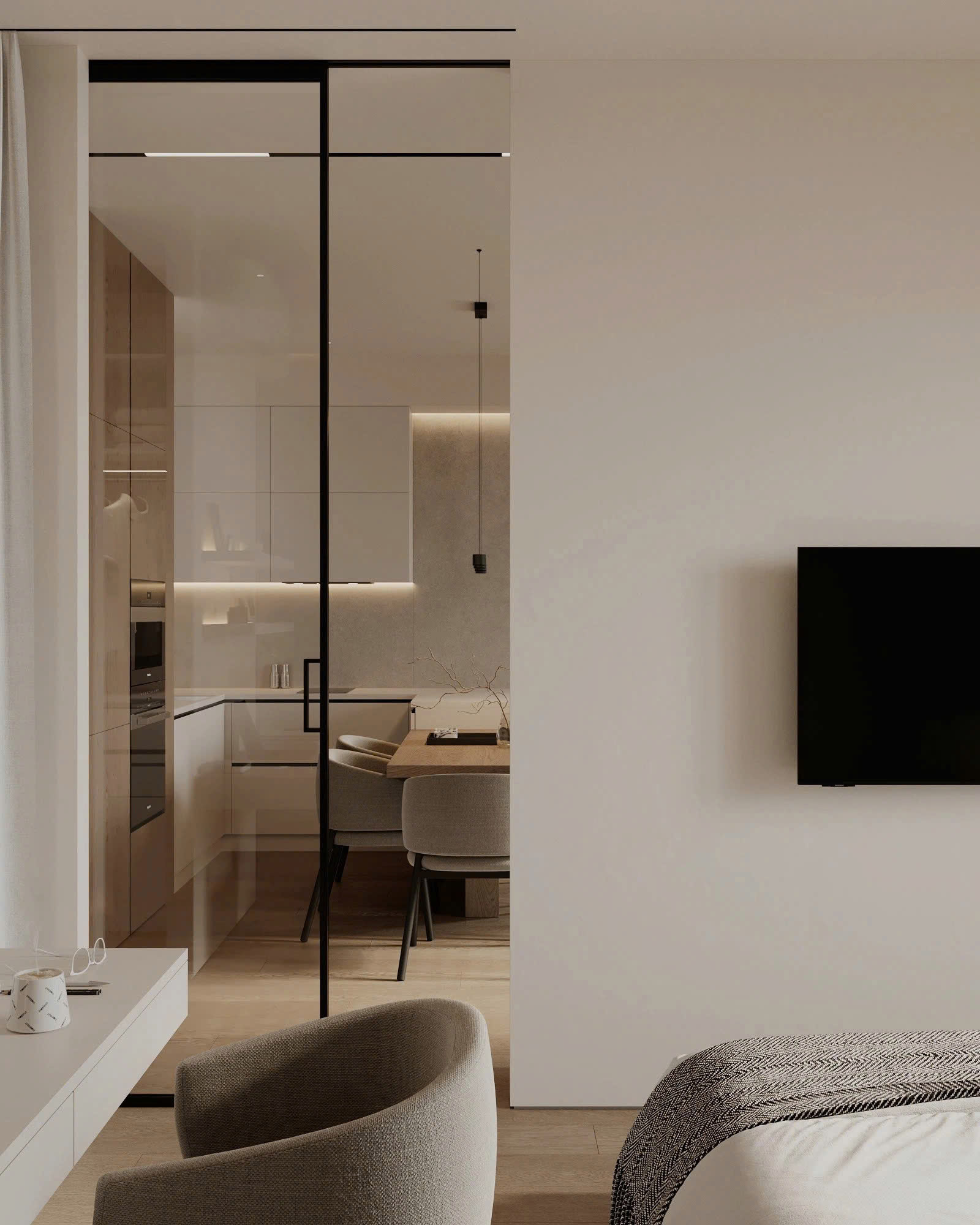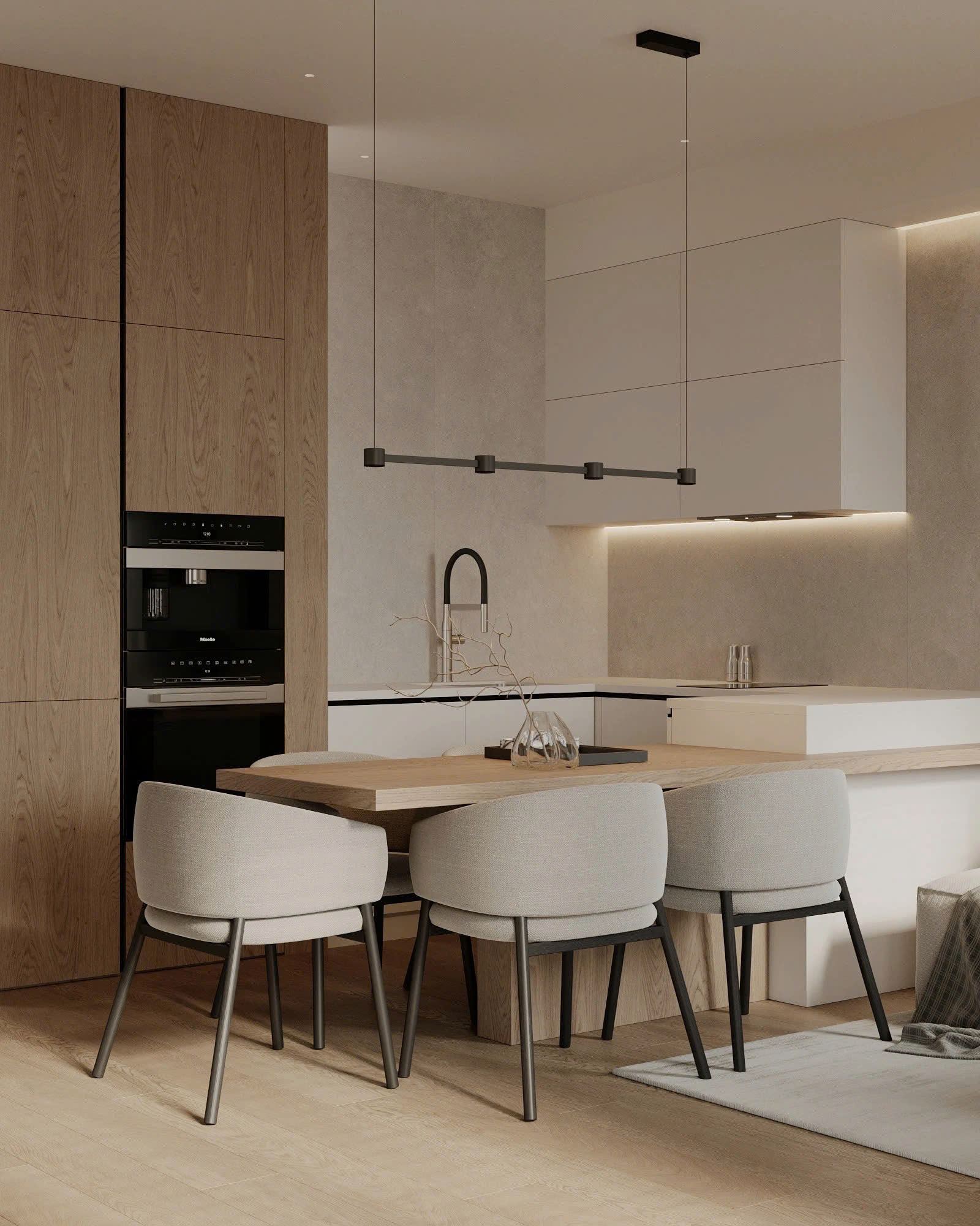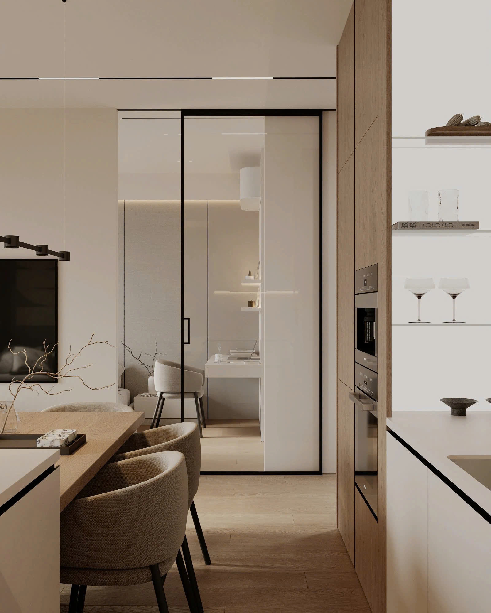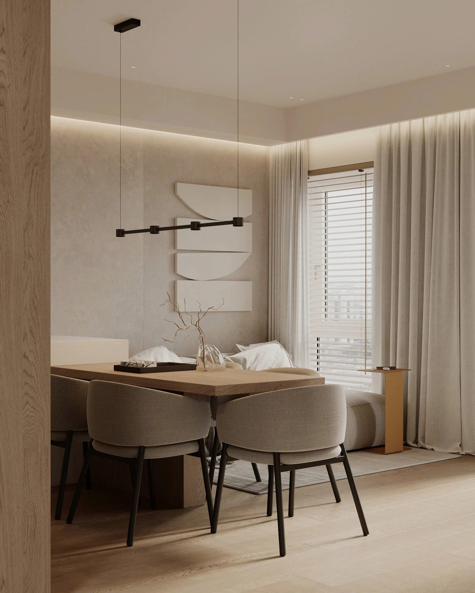Không gian mở giúp gia đình gắn kết hơn. Sofa tông ghi sáng, kiểu dáng thời thượng kết hợp kệ tivi đặt đất đồng màu gỗ. Bộ bàn ăn cùng tông, ghế cách điệu ấn tượng, đi kèm đèn thả tạo điểm nhấn. Decor tranh tường, gối ôm, ánh sáng hắt nhẹ nhàng giúp không gian ấm áp, tinh tế.