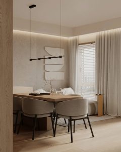 – Điểm nhấn: sofa ghi sáng thời thượng, bàn ăn cùng tông ghế cách điệu, tranh tường lạ mắt, ánh sáng đèn thả & LED hắt.