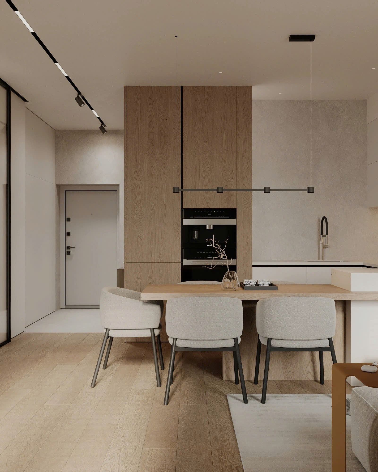 – Bảng màu: nâu gỗ ấm áp + trắng sáng tinh tế.