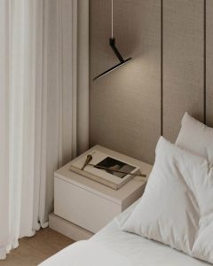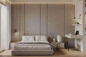 – Phương án cao cấp: giường bọc nỉ mang hơi thở Âu, ốp tường vân kẻ vải Hàn Quốc, đèn rọi & tranh nhấn.